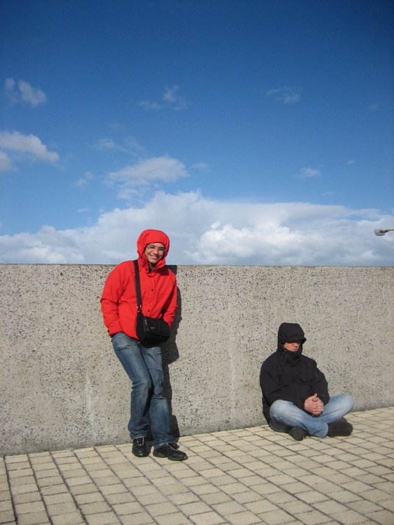 Wearing raincoats, standing so low, in the sun. Two of us.