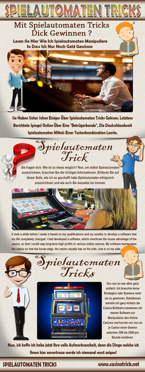 Weder die Spiele von Novoline, noch die Tischklassiker lassen sich mit Spielautomaten Tricks überlisten. Wer wirklich auf der Suche nach einem Spielautomaten Trick ist, der kommt an dem Angebot von http://www.casinotrick.net/spielautomatentricks.htm nicht vorbei. Hierbei handelt es sich – so kann ich heute sagen – um den einzigen, mir bekannten Spielautomaten Trick, der wirklich zuverlässig und risikofrei funktioniert.