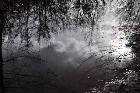 February sky reflected on a forest puddle. Burgundy France