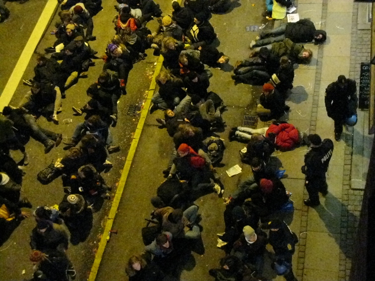 The group caught with a mass arrest of 300-400 from the climate demonstration, COP15, Amagerbrogade, Copenhagen, Denmark. 12-12-2009. They waited about 4 hours to get to jail, most of them released after the jail experience. The air was cold only 2 Cº. They were very tired.