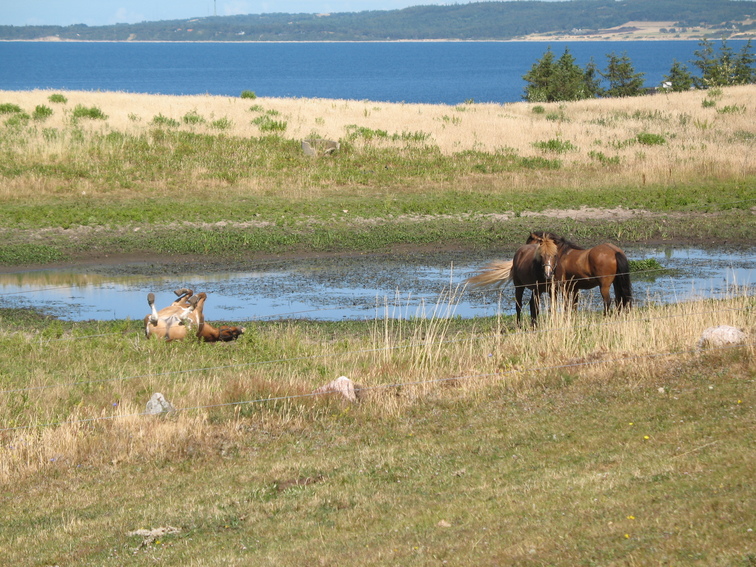 Horses on Hesselø/ Hessel island. Sjælland/Sealand in the horizon