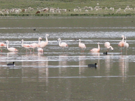 lake with flamingoes and lamas, Peru