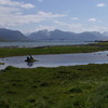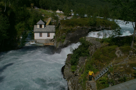 Wasserfall des Gebirgsflusses bei Valldal (Südnorwegen) mit kleinem Kraftwerk und Lachstreppe