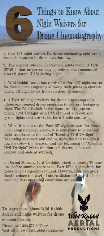 ![]() Part 107 night waivers for drone cinematography are a recent innovation in drone aviation law. Log on http://www.wildrabbitaerial.com/