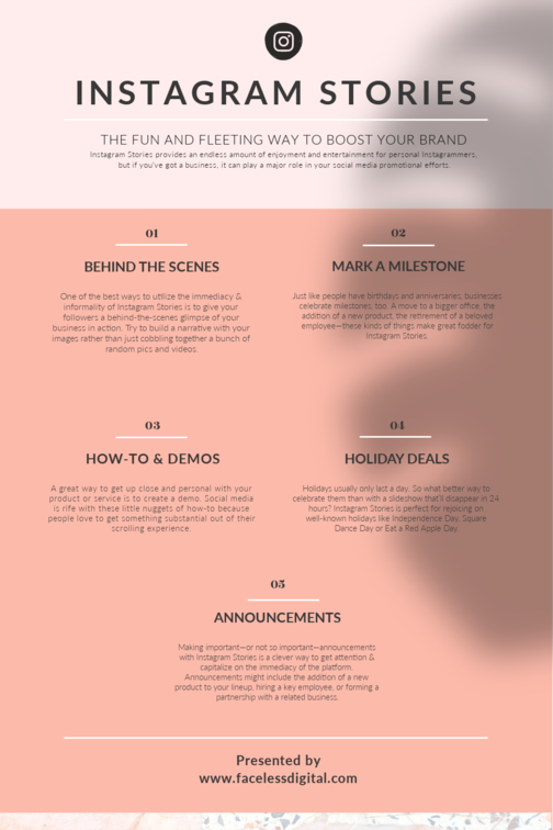 About half of Instagram’s monthly users are using Stories. That’s 500 million people posting 1 billion Stories every day. And about 62% of those people say they’ve become more interested in a brand or product after seeing it in their Stories. Whether you’re just getting started or looking to master the latest subtleties, we’ve got the complete rundown on best practices for this format. For more info visit https://www.facelessdigital.com/our_service/social-media-management/