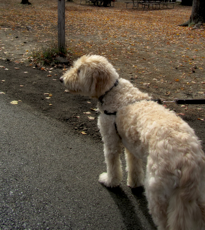 Golden Retriever x Standard Poodle ▬▬▬▬▬▬▬▬▬▬▬▬▬▬▬▬▬ Bear Mountain State Park, Rockland County, NY. Full spectrum color, high definition photo… ✍ No matter what the owners tried, the obstinate dog refused to face the camera (or "sit" or "come" or anything else).... It was still photo worthy, though, to show off the wonderful texture to its fur coat.... |
