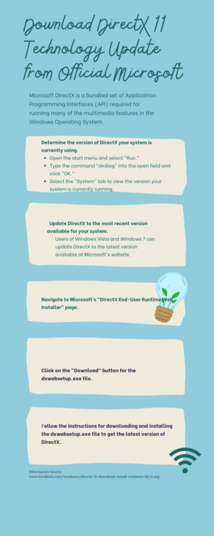 It is an application programming interface that has been designed to maintain and uplift the relationship between graphics cards, multimedia hardware, and operating system. It is compatible in Microsoft Windows operating systems. Download DirectX 11 Technology Update from Official Microsoft is enriched with new and improved features that allow the game developers to make coding simpler to provide great effects. Website: https://www.htmlkick.com/windows/directx-11-download-install-windows-10/