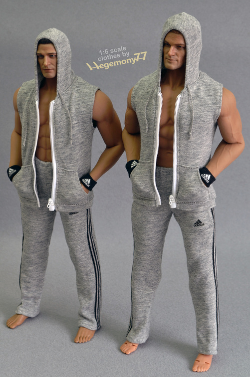 1 /6 scale TBLeague Phicen M33 and M34 custom kit bash figures in the same Hegemony77 clothes - sweatpants sleeveless zip hoodies and wristbands- https://www.hegemony77.com/