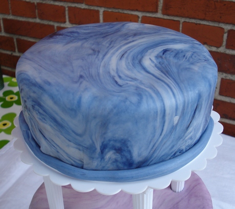 Lyse bisuitebunde med fyld af mørk- og hvid chokoladeganesh samt friske jordbær med flødecreme med chokoladestykker og makroner. Herpå marcipantop og overtrukket med blåmarmoreret fondant. |