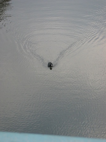 Blick von der "Barmbeker Straße" auf den Osterbekkanal. Die Sonne brach hier und da durch die Wolkendecke. Die Ente war soeben gelandet und paddelte auf die Brücke zu. |
