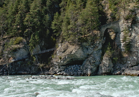 Seen from the picnic area by the Inn. Note the stonefilled cavities. Maintainers do this to keep the river bend from taking more of the mountainside . / Vom Brotzeitplatz am Inn gesehen. Die Unterspuelungen sind mit geschichteten Flussteinen aufgefuellt. Die Menschen, die den Weg instandhalten, tun dies wohl, um die Flussbiegung davon abzuhalten noch mehr vom Berg abzutragen. |