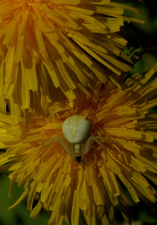 A capital pale female with prey and an intriguing "baphomet" style marking on the abdomen, hunting in a dandelion. / Ein sehr grosses bleiches Weibchen mit einer interessanten "Baphomet Siegel" Zeichnung auf dem Hinterleib, mit Loewenzahn als Ansitz. |