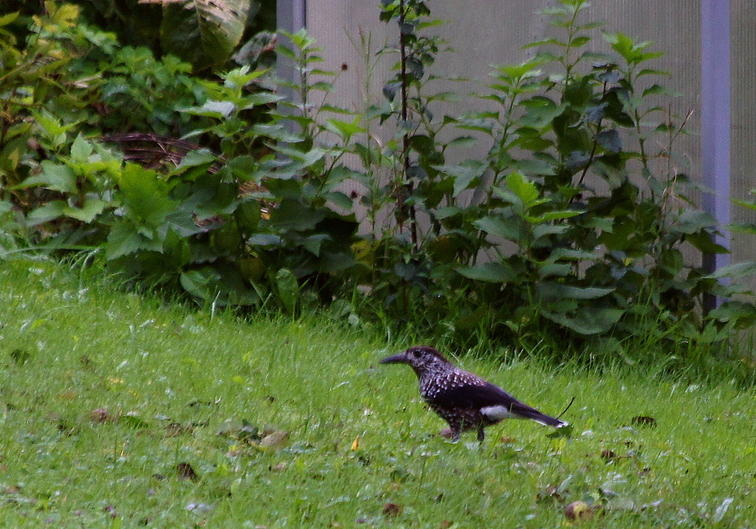 Nutcrackers tend to visit rarely and briefly in late summer and only in bad weather. In winter they return to dig out their stuff and may stay longer when they find a feeder near a cache. They breed in the high alpine ranges near the edge of the treeline but their winter range goes all the way across the foothills to the plain, and they can remember all their trees on their route.