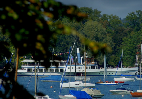 The 110 year old girl is still a great beauty. Going with a regular motor makes her not less charming. 5 years ago we did travel with her, this year I only spotted her on the Landing of Herrsching as we where preparing to leave the restaurant for a walk. / Das 110 Jahre alte Maedchen ist eine Schoenheit. Dass sie nicht mehr Dampf betrieben ist, schadet eigentlich nicht. Vor 5 Jahren fuhren wir alle mit ihr ein Stueckchen, dieses mal sah ich sie nur am Herrschinger Anleger als wir uns gerade anschickten die Beine vertreten zu gehen. |