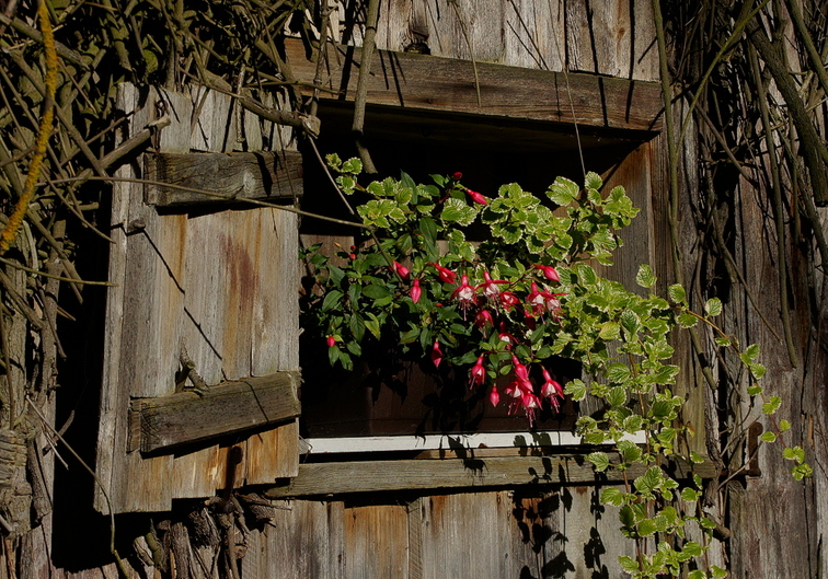Fuchsien in einem Stadlfenster beim Ausflugslokal Alttrauchburg.