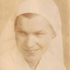 Anne Dorthe Andersen (gift Frederiksen) i sygeplejerskens arme foran sygehuset i Løgstør