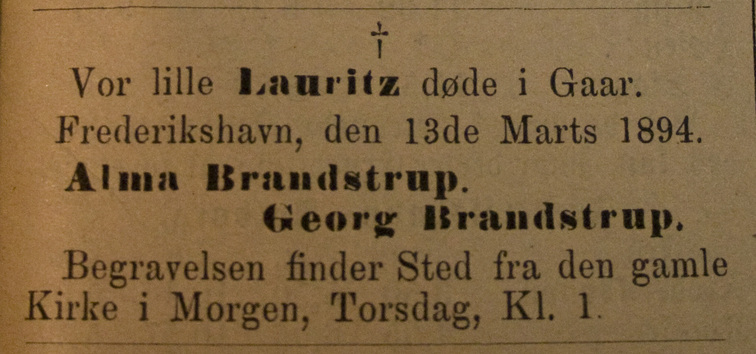 Vor lille Lauritz døde i Gaar. Frederikshavn, den 13de Marts 1894. Alma Brandstrup. Georg Brandstrup. Begravelsen finder Sted fra den gamle Kirke i Morgen, Torsdag, Kl. 1. |