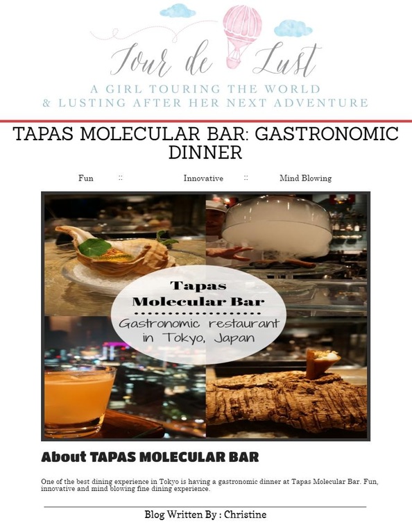 One of the best dining experience in Tokyo is having a gastronomic dinner at Tapas Molecular Bar. Fun, innovative and mind blowing fine dining experience. To read fll blog please viist at http://tourdelust.com/tapas-molecular-bar/ |