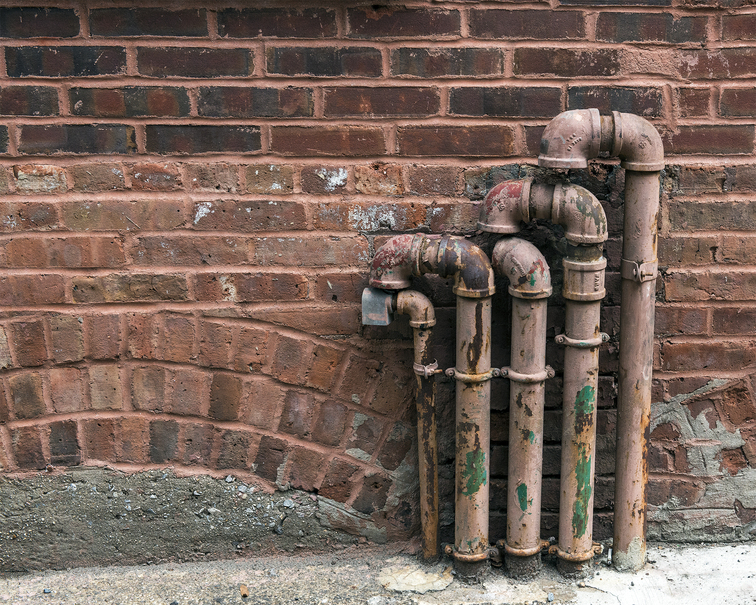 Mysterious arrangement of piping and an old brick wall