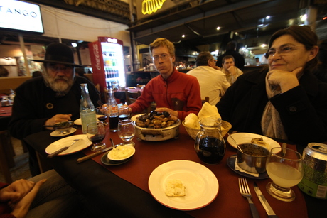Unser erstes echtes Asado, Vorspeise: Innereien (Dünndarm und Speichedrüse), süße Blutwurst und Chorizo! Carsten sitzt zwischen Herrn Armin und Frau Sonia Ihle.