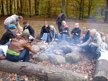 Hele holdet rundt om bålet ved den store bålplads i Hareskoven.