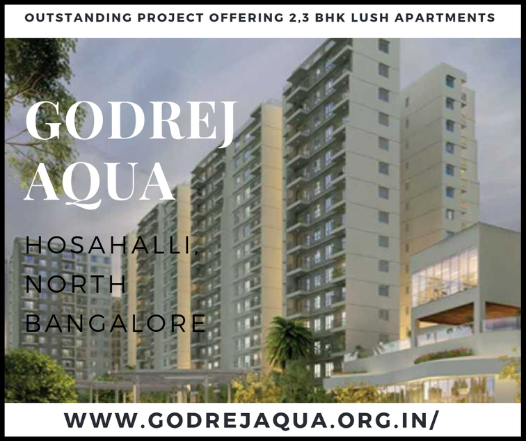 Godrej Properties new launch residential project named Godrej Aqua coming soon at Hosahalli, North Bangalore. Project offers 2,2.5,3 BHK lush apartments. These well designed and spacious apartments are to be constructed in area ranges from 1103 to 1900 sq.ft. Several amenities are merged in the project like swimming pool, gym, kids paly area, open space, meditation centre, power backup, car parking etc. Godrej Aqua price range starts from Rs.57 lakhs.