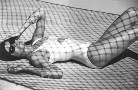 Brazilian Model Barbara Fialho for French L'officiel wearing a white one piece swimsuit.