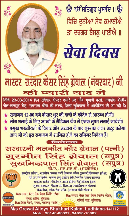Dear friends, Good Morning, you are requested to attend "SEWA DIWAS" 10 th Barsi of my father Sardar Kesar Singh Grewal ji, on 23rd March, Sunday from 12:00 noon at our residence Village Bhukhari Kalan, New Central Jail -Tajpur Road, Ludhiana, Punjab- Sukhminderpal Singh Grewal |
