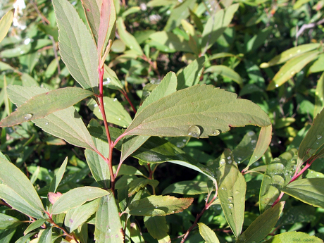 Raindrops on a bush in the front garden.
