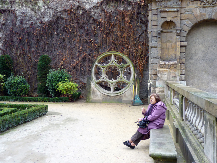 Smoking in the garden of Hôtel de Sully. Little did she realize she had a perfect squared circle on her right.