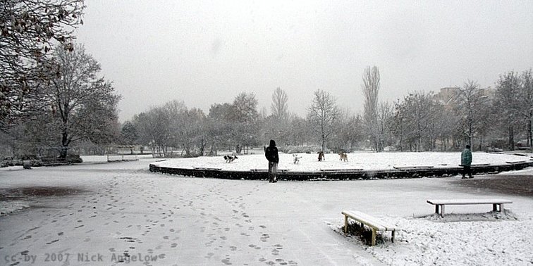 Very nice photo! Looks so quiet, so fresh, these playing dogs and the tracks left on the alleys gives such a cosy atmosphere. :)