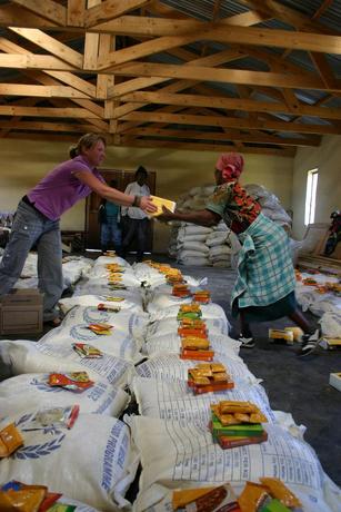 dorcas verstrekt voedselhulp. Honing groentesoep, high protein chocalete bars en 25 KG meel...
