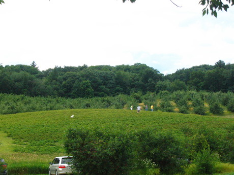Strawberry field (with cherry trees in foreground and Christmas trees in background)