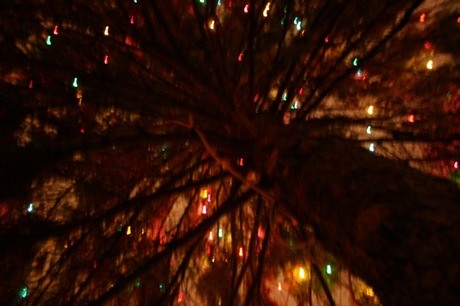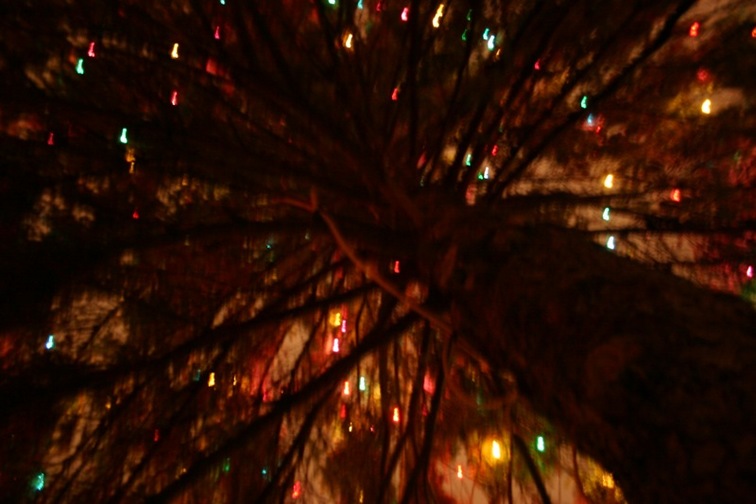 Under a tree, looking up.