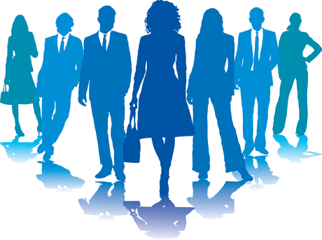 A small group of business people in blue silhouettes