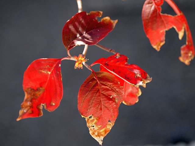 ハナミズキ (花水木, Flowering Dogwood) の紅葉 だいぶ赤みがのってきました。 久しぶりのお日様に輝いています。 色が変わり始めた頃、熟した実は、 鳥さんたちが食べ尽くしてしまい、 人間(私)の思惑を嘲笑うかのよう。 tags: leaves |