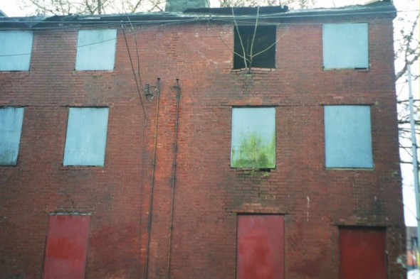 Abandoned building with tree growing out of it and colorful window boardings.