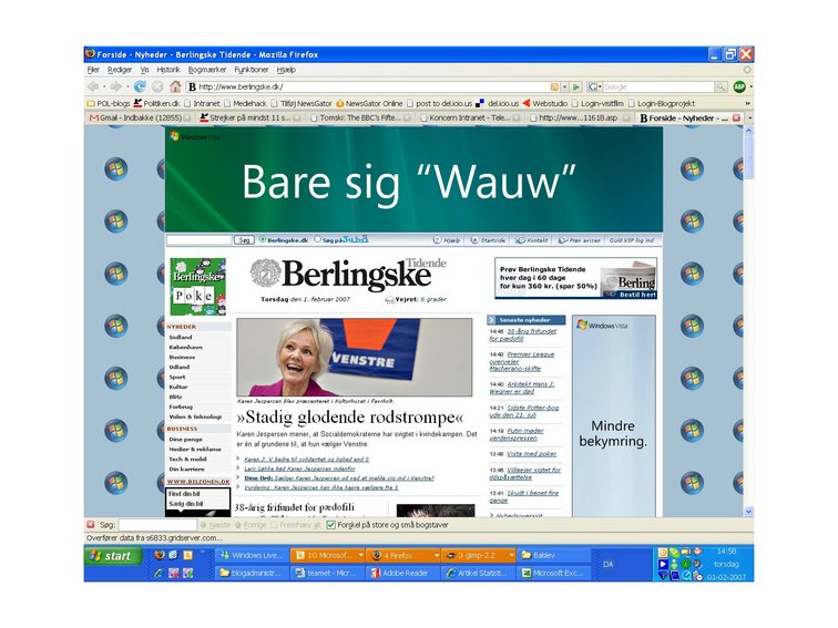 ![]() Et totalkoncept for bannerannoncer hos Berlingske. Windows Vista reklame all over. Lidt for heftigt efter min mening