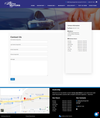 Apna Motors is a pre-owned, late model dealer that provides customers with a complete automotive experience at competitive prices. Finance Used Cars. We provide Best car prices in Surrey. We Located 12880 king George blvd Surrey BC V3T 2S9. Apna Motors is dedicated to customer satisfaction and we have provided you with a map, as well as our address and phone number to help you find us easily. We are passionate about luxury cars and we are intent on sharing that passion with you when you purchase your new car from us.