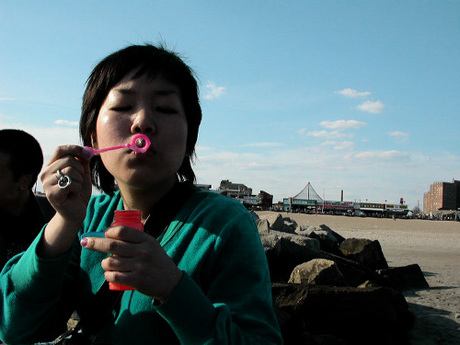 min blows bubbles at the beach. coney island