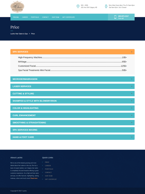 Lachic Hair Salon offer price list of services. We provide Spa services, laser services, hair salon, microdermabrasion, cutting & styling, curl enhancement and hand & foot care services in Calgary