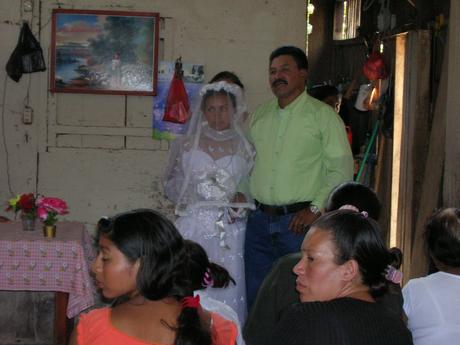her er bruden og hendes far i kirken. fin men lidt kunstig kjole.