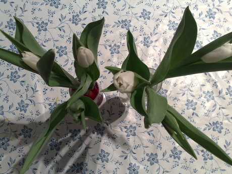Puslerier med Findus, Linnea og Julius. Tulipaner i vand med rød frugtfarve og tulipaner i vand.