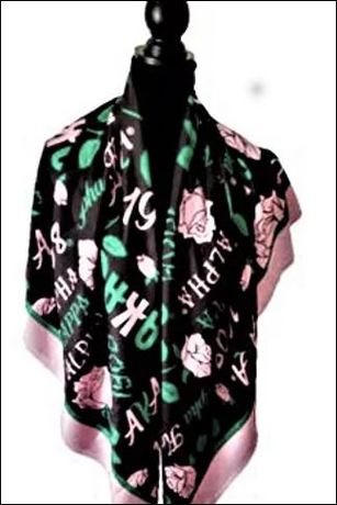 Wrap this big Alpha Kappa Alpha scarf around your neck. A variety of AKA letters, 1908, and pink flowers are all surrounded in pink on a black backdrop. 54" × 54" Polyester. https://www.akagreek.com/product-page/aka-large-black-scarf-or-shawl-1 |