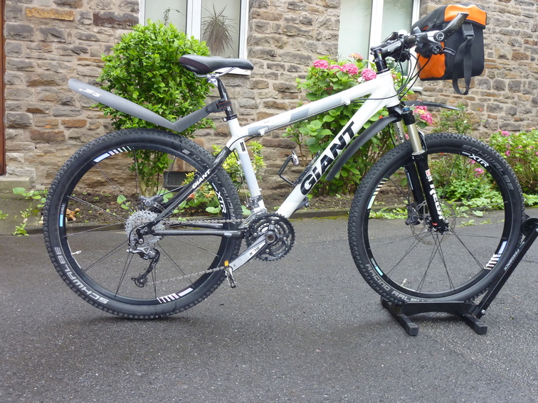 Giant xtc mit Zubehör (Mudguards von SKS, Flaschenhalter von elite, Lenkertasche von Ortlieb). Rohre aus Alu. Streben aus Carbon. Anbauteile Ritchey WCS, Lenker, Hörnchen und Sattelstütze sind ebenfalls aus Carbon.