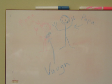 Aaron's drawing of our new family... mama (in pink- hard to see) papa and Vaugn