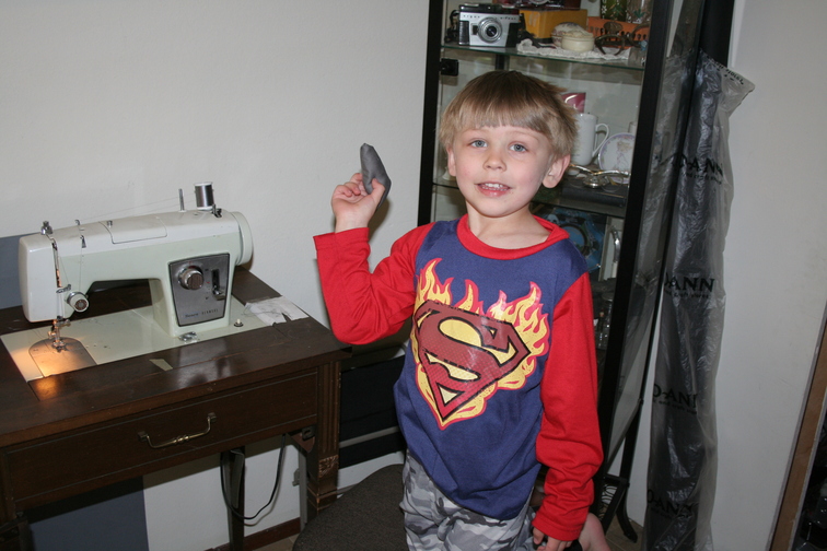 Vaugn showing off his first sewing project: a stuffed mouse!