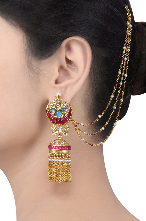 ![]() Tribe Amrapali's Jhumka Earrings with Hair Chain are a majestic blend of tradition and elegance. These earrings feature intricately designed jhumkas attached to delicate hair chains that gracefully hook into the hair, creating a royal and eye-catching look. Crafted in silver or gold-plated finishes, they showcase fine detailing inspired by classical Indian motifs. Ideal for weddings, dance performances, and festive occasions, they frame the face beautifully and add dramatic flair. The fusion of earring and hair accessory offers both beauty and cultural richness. Tribe Amrapali’s design brings heritage alive with bold, regal charm.