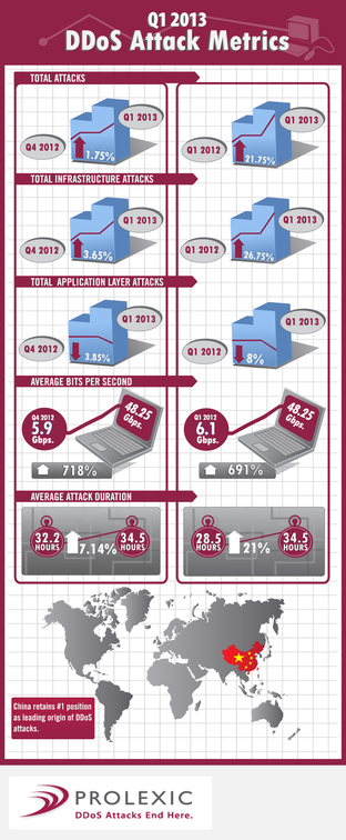 Over time, the nature of DDoS attacks has changed. They have become more intense and destructive. This infographic, DDoS Attack Metrics, compares key metrics of DDoS attacks mitigated by Prolexic in Q1 2013 compared with previous quarters. This infographic reveals: • The total number of attacks per quarter have steadily increased • The total number of infrastructure attacks have increased, while application layer attacks have decreased • The average bits per second rate increase a whopping 691% over the past year, from 6.1 Gbps in Q1 2012 to 48.25 Gbps in Q1 2013 • The average bits per second went up 718% in just one quarter, from 5.9 Gbps in Q4 2012 to 48.25 Gbps in Q1 2013 • Average attack duration went up 7.14% from the prior quarter and 21% from the prior year • China retained the position in Q1 2013 of being the leading origin of DDoS attacks For a more detailed view into recent global DDoS attacks and a full analysis of them, download the most recent Global DDoS Attack Report. http://www.prolexic.com/knowledge-center-ddos-attack-metrics-2013-q1-infographic.html |