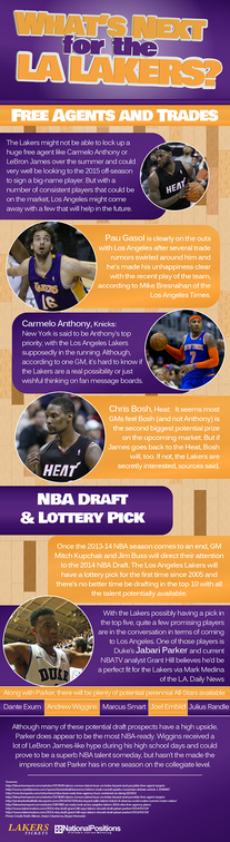 With their current win versus loss ratio, the L.A. Lakers are hoping to use the NBA Draft in order to sign some new players. Since the L.A. Lakers will have a lottery pick for the 2014 NBA Draft, the team should be able to pick up talent that will improve the team. This is good news since there are a lot of potentially great players ready to start their professional basketball career. In addition to signing some top picks from the 2014 NBA Draft, the L.A. Lakers are also hoping to sign some free agents. A few strong players have contracts that will expire after the 2013-2014 season and the L.A. Lakers are interested in offering these players contracts. By signing strong draft picks and free agents, the L.A. Lakers should have a great 2014-2015 season. |
